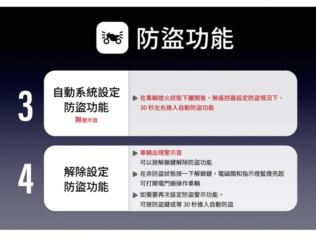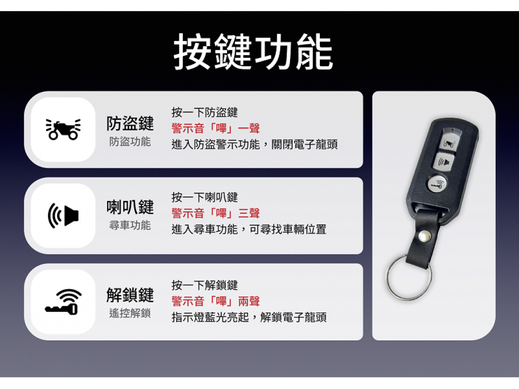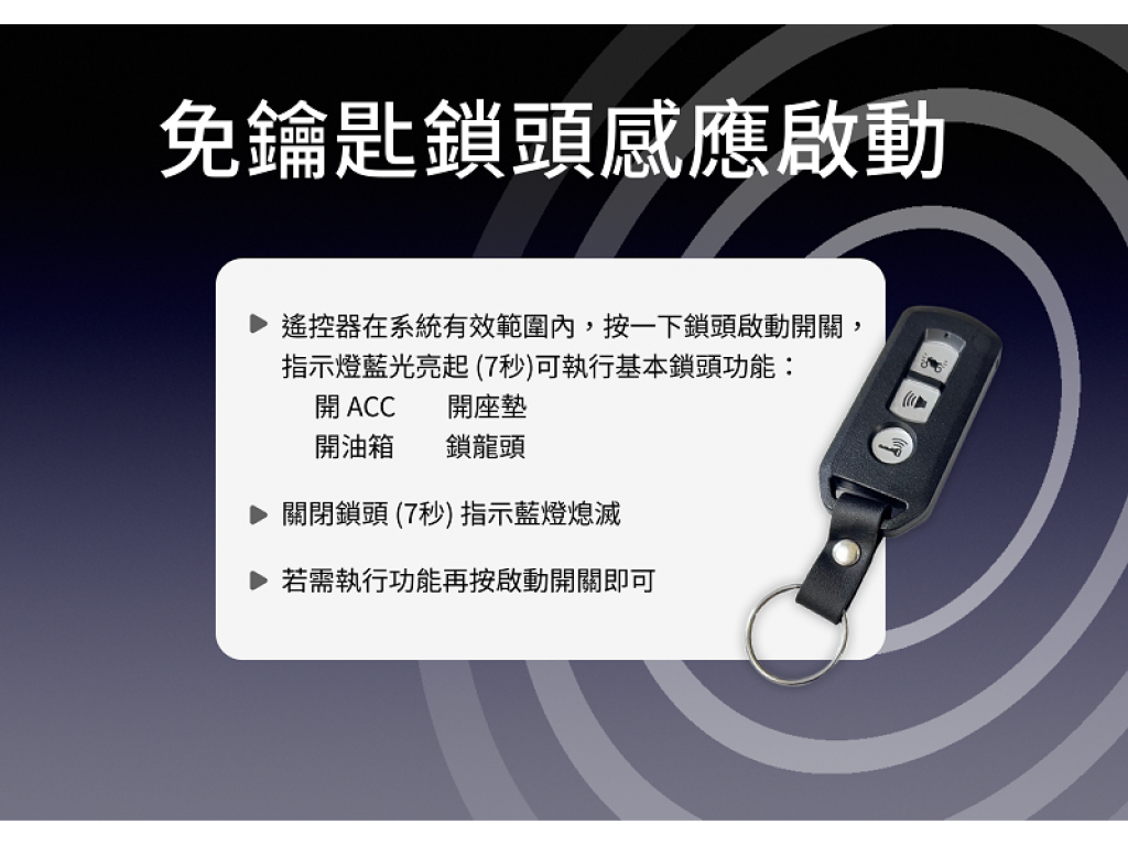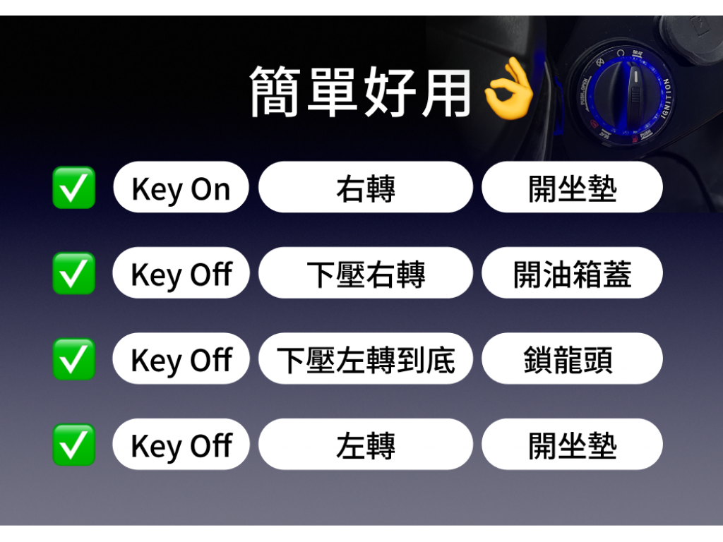 安裝上車後立即享受騎車時免找鑰匙的便利性